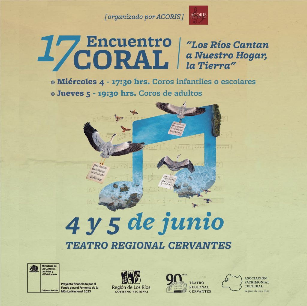 Coros de cuatro comunas de la Región de Los Ríos participarán en el 17° Encuentro Coral Los Ríos Cantan a Nuestro Hogar, la Tierra. Este es un gran evento organizado por la Agrupación Coral de Los Ríos (ACORIS), que cuenta con financiamiento del Ministerio de las Culturas, las Artes y el Patrimonio a través del Fondo para el Fomento de la Música Nacional 2023.